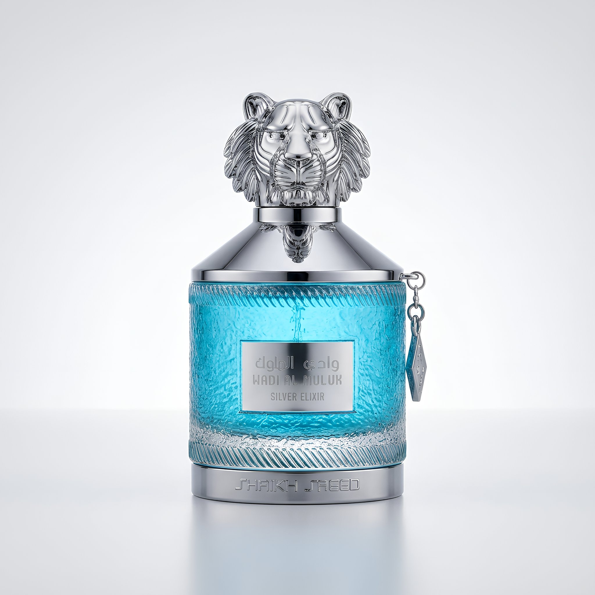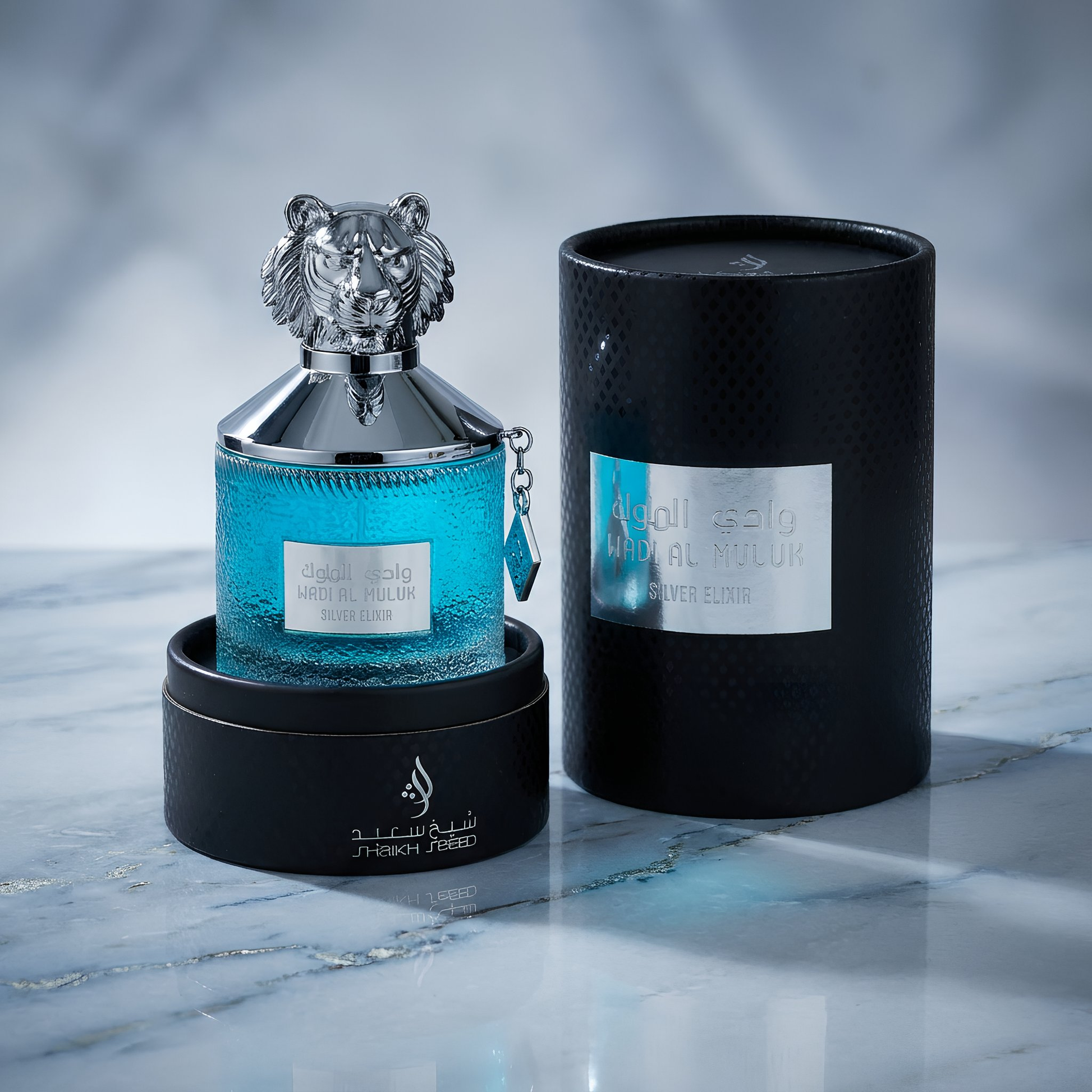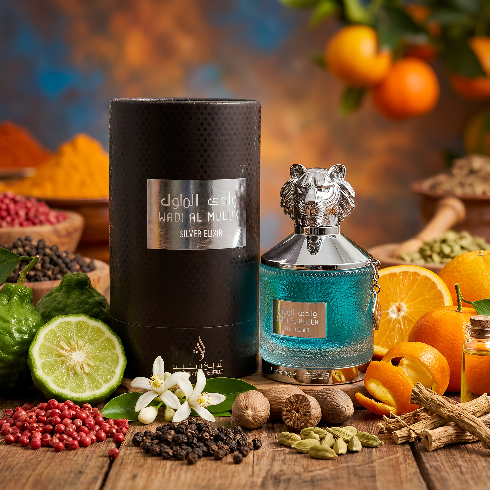 Experience the opulence of WADI AL MULUK SILVER ELIXIR. Refreshing notes of bergamot, orange, and mandarin awaken the senses. Spicy hints of pink pepper, pepper, and nutmeg create a bold and alluring aroma. Infused with vetiver oil for a luxurious touch.